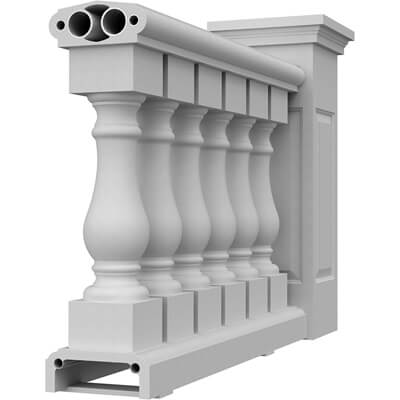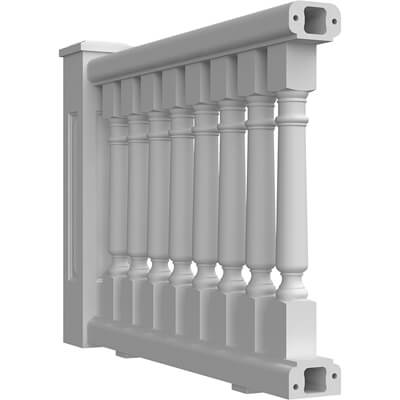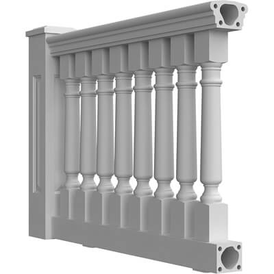 We have been manufacturing exterior composite balustrade systems for over 20 years. Our balustrades, manufactured using a rotational cast method, are made from a resinous marble matrix that is reinforced with fiberglass strand. Our casting method results in a reinforced hollow construction that will last a lifetime but will not cost an arm and a leg: In addition to the savings in materials and installation, you will significantly save by not needing to reinforce your structure to support the added weight of natural stone, cast stone, or concrete alternatives. Our systems weigh from 15 to 100 lbs per lineal foot depending on the configuration so they are very robust but, when compared to stone and concrete which are warrantied for no more than a few years, we are half to a third of the weight.