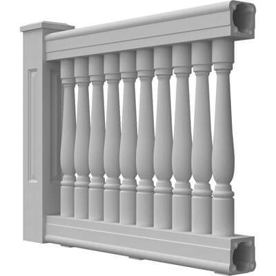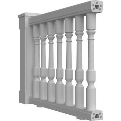 We offer an assortment of standard balusters ranging from 1″ pickets to 10″ wide belly spindles. Our railings range from 4″ to 10″ wide with our 7-1/2″ medium system being the most popular. Most of our combinations are made to work with recessed panel posts that have a panel on all 4 sides. We also offer posts with routed edges or plain panels ranging from 7″ to 26″ wide and from 30″ to 50″ tall. We offer matching panels spanning up to 8’ long that can be used to create large custom posts or planters. Our caps are offered in a standard routed edge style or in a decorative tiered level style with peaked or flat tops. Our systems can be accented with an assortment of finials, including: urns, artichokes, or balls.