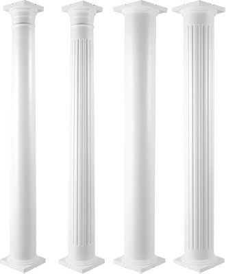 Diameters range from 6″ to 24″ in two inch increments (except 22″), and heights range from 6′ to 30′ in two-foot increments. NOTE: shaft heights of columns are typically LESS than nominal height. The cap and base attach to the ends of the shaft, adding their height to the overall height of the finished column to achieve the stated nominal height.
