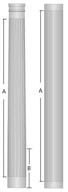 On 6″ through 12″ tapered Colonial columns, flutes start 9″ from the top of the column shaft (measured from the scribe line) and end approximately 7″ to 8″ above the base (to allow field trimming). On 14″ and larger columns, flutes start 9 1/2″ from the top of the column shaft, and end approximately 3″ to 4″ above the base.